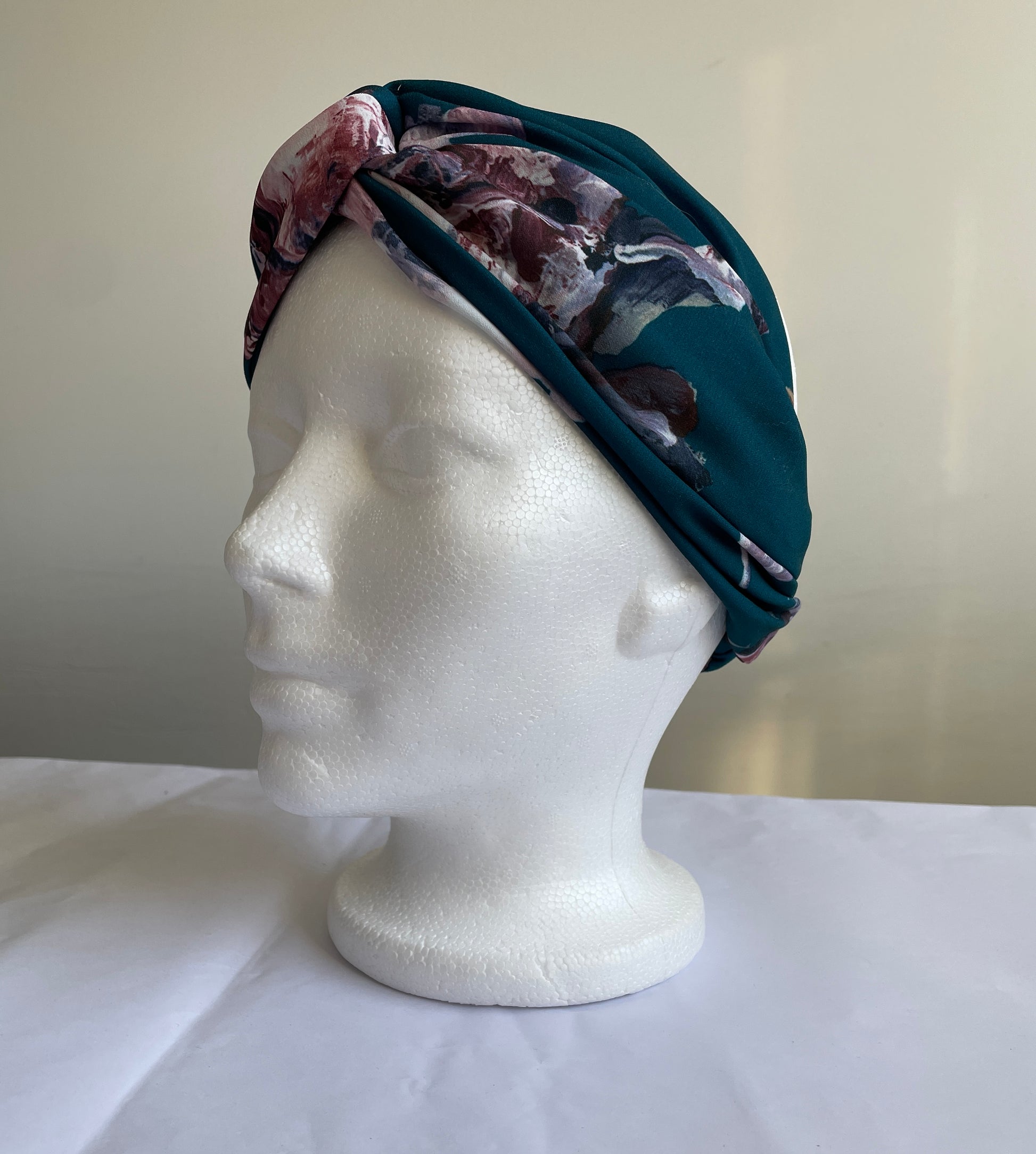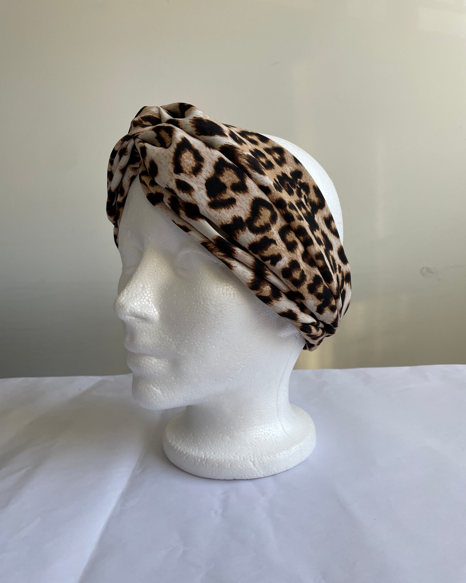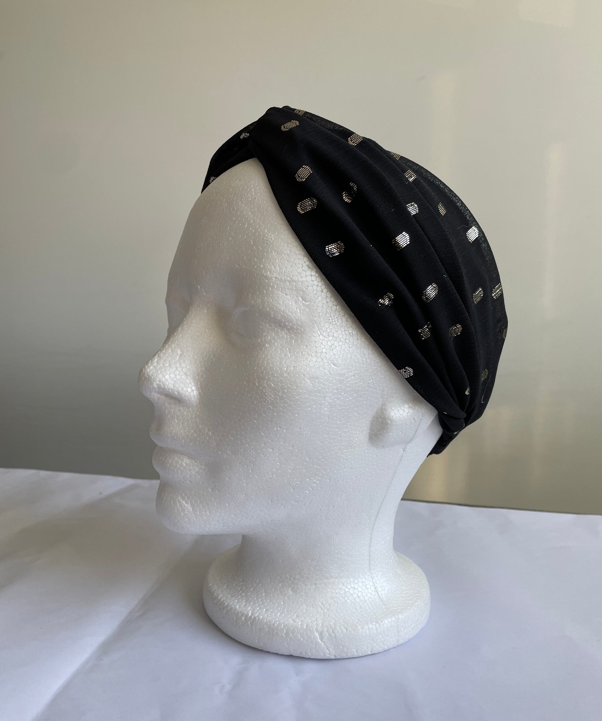 Bandeau pour cheveux avec noeud et ampleur sur le dessus et élastique au niveau de la nuque.