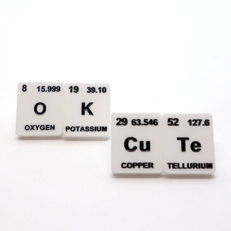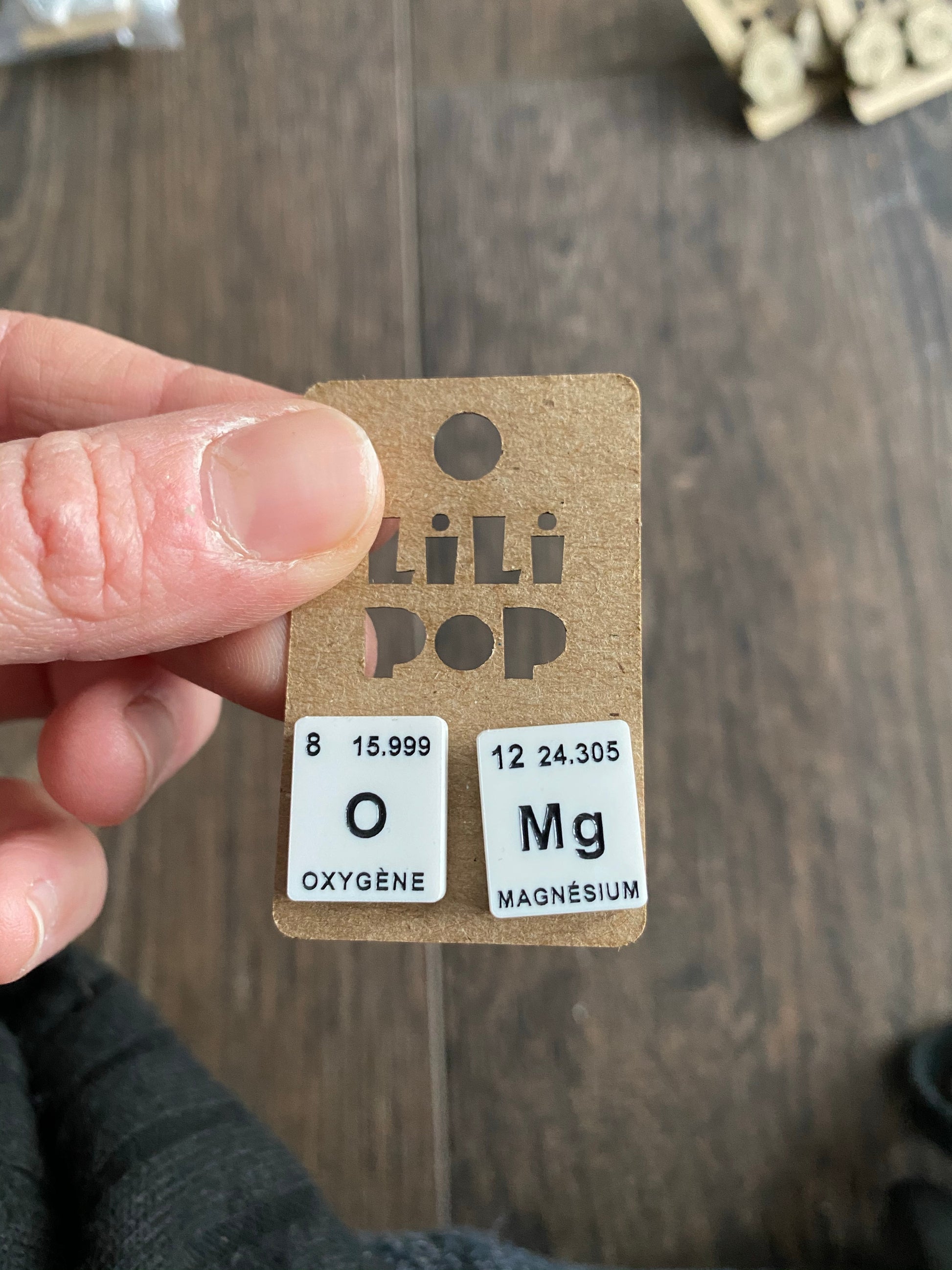 Boucles d’oreilles fabriquées à partir de plastique blanc, noir ou aqua récupéré, gravé et découpé au laser. Remplissage de peinture rose, dorée ou blanche.