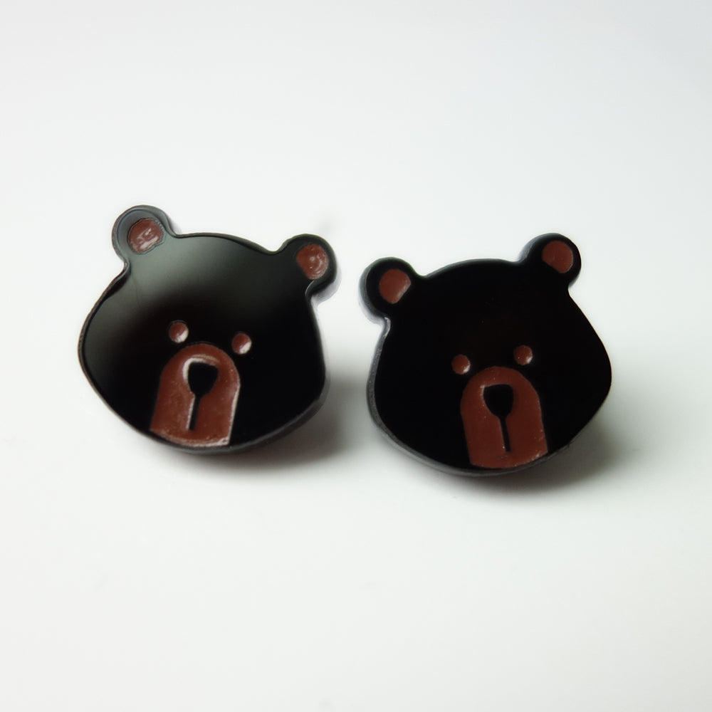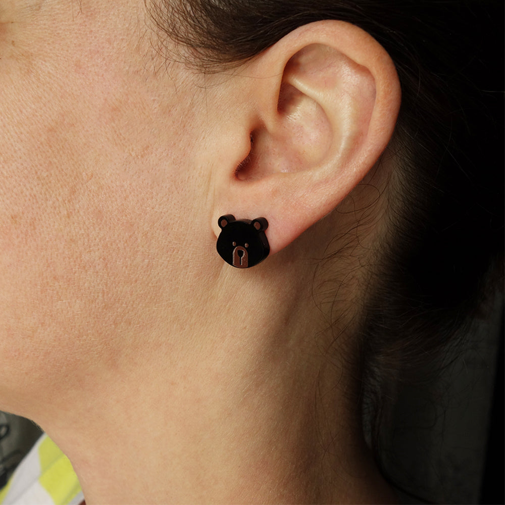 Boucles d'oreilles fabriquées à partir de plastique récupéré, gravé et découpé au laser. Remplissage de peinture brune.