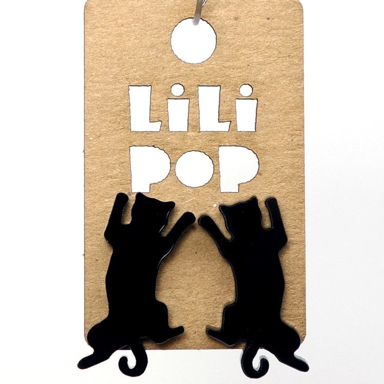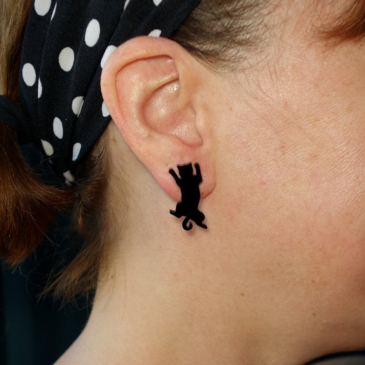 Boucles d'oreilles fabriquées à partir de plastique noir récupéré, gravé et découpé au laser. Remplissage à la main de peinture noir
