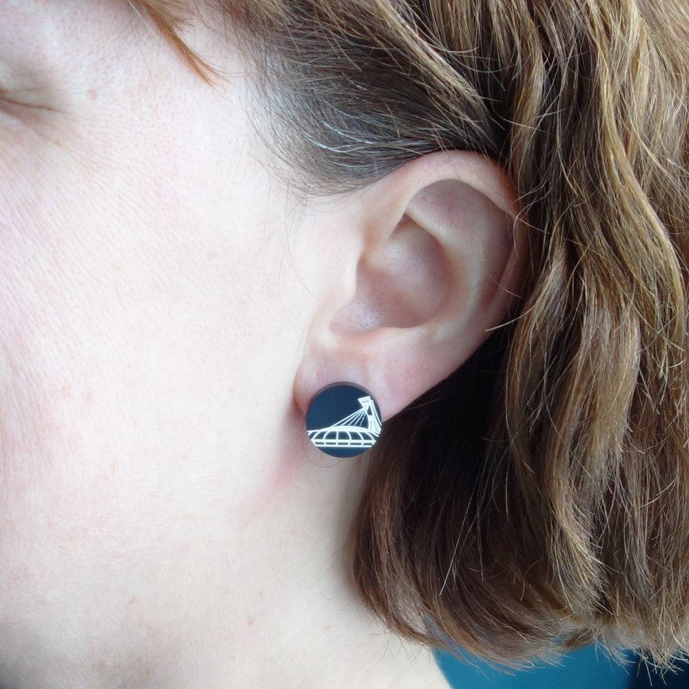 Boucles d'oreilles fabriquées à partir de plastique récupéré, gravé et découpé au laser. Remplissage de peinture blanche.