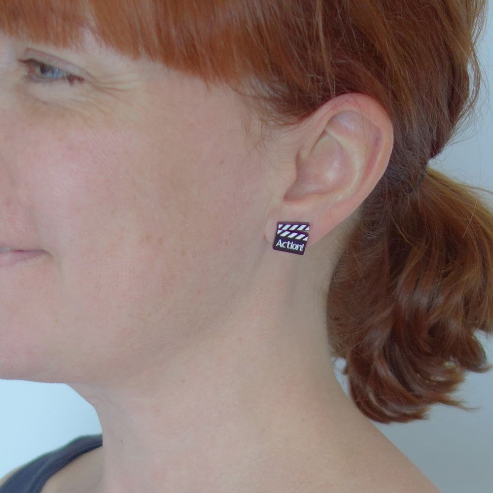 Boucles d'oreilles fabriquées à partir de plastique récupéré, gravé et découpé au laser. Remplissage de peinture blanche.