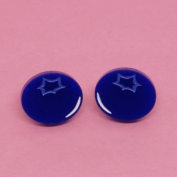 Boucles d’oreilles fabriquées à partir de plastique bleu récupéré, gravé et découpé au laser. Remplissage de peinture blanche et bleue.