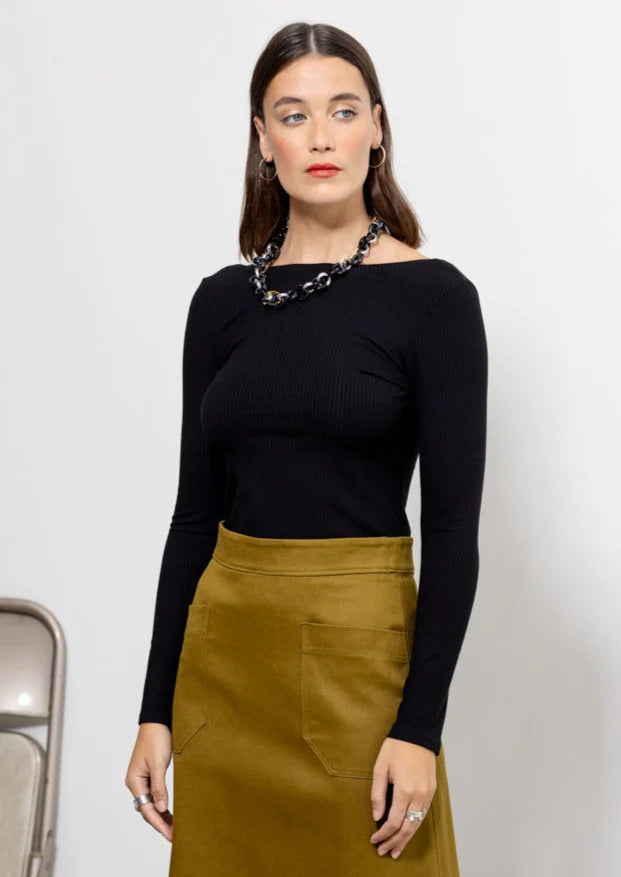 Chandail manches longues, coupe ajustée et encolure dos très basse.