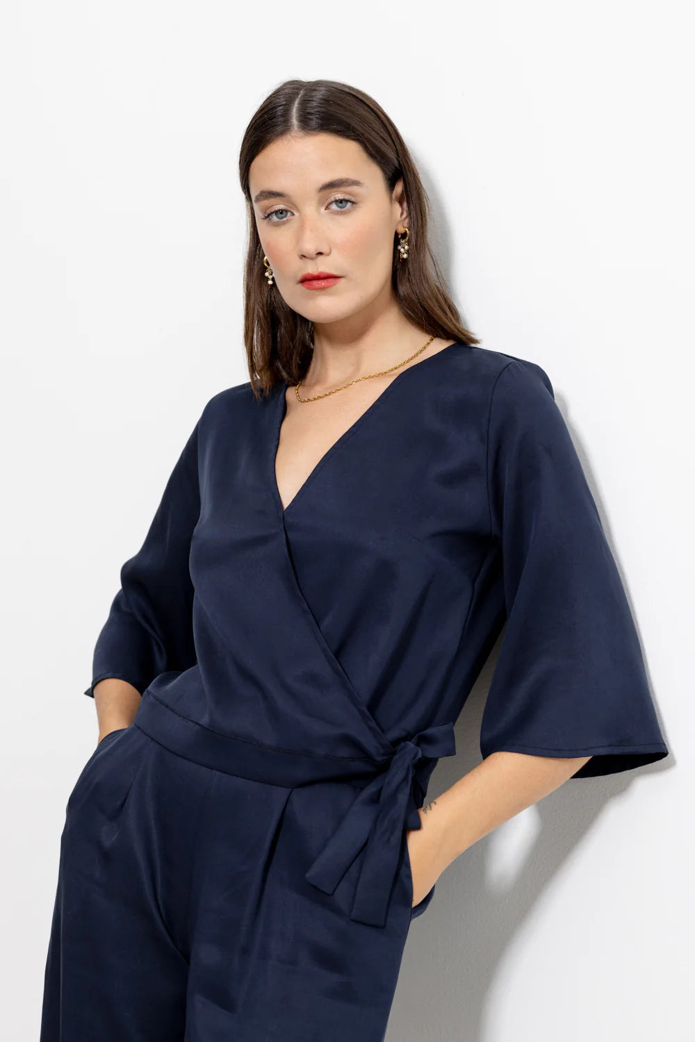 Haut cache-coeur, manches aux coudes évasées.Ganse ajustable au côté gauche.
