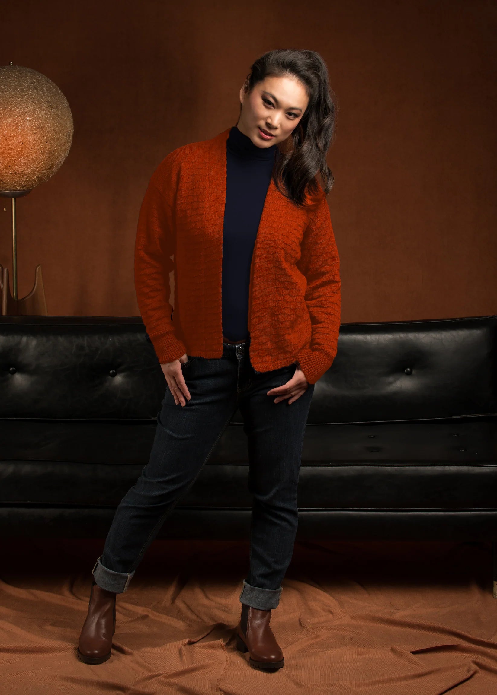 Veste de tricot en fines mailles texturées. Manches tombantes, se porte ouverte, coupe droite, manches longues, tricot de type "Fully fashion"