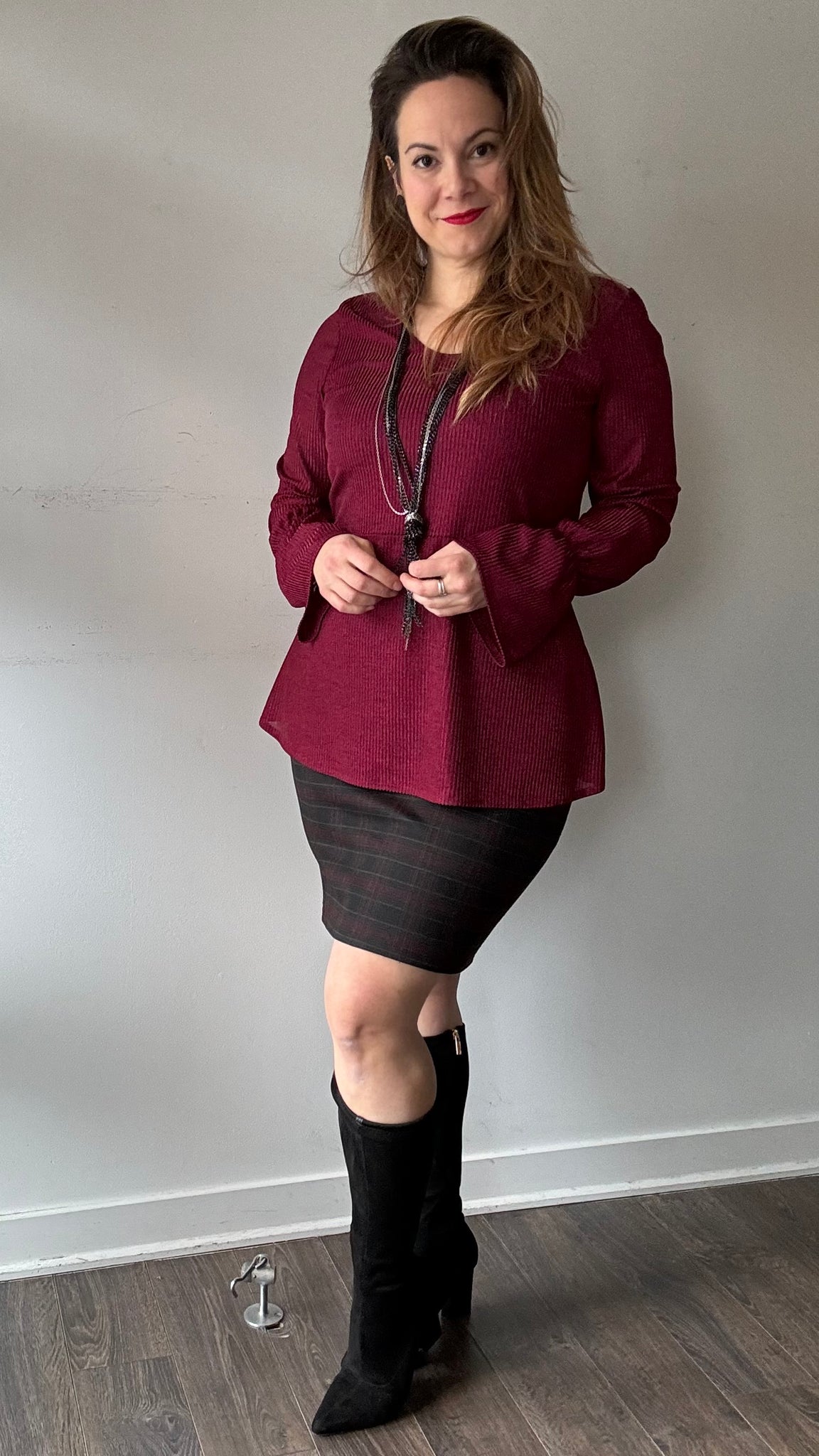 Haut manches longues avec élastique au poignet. Encolure ronde. Basque au bas.