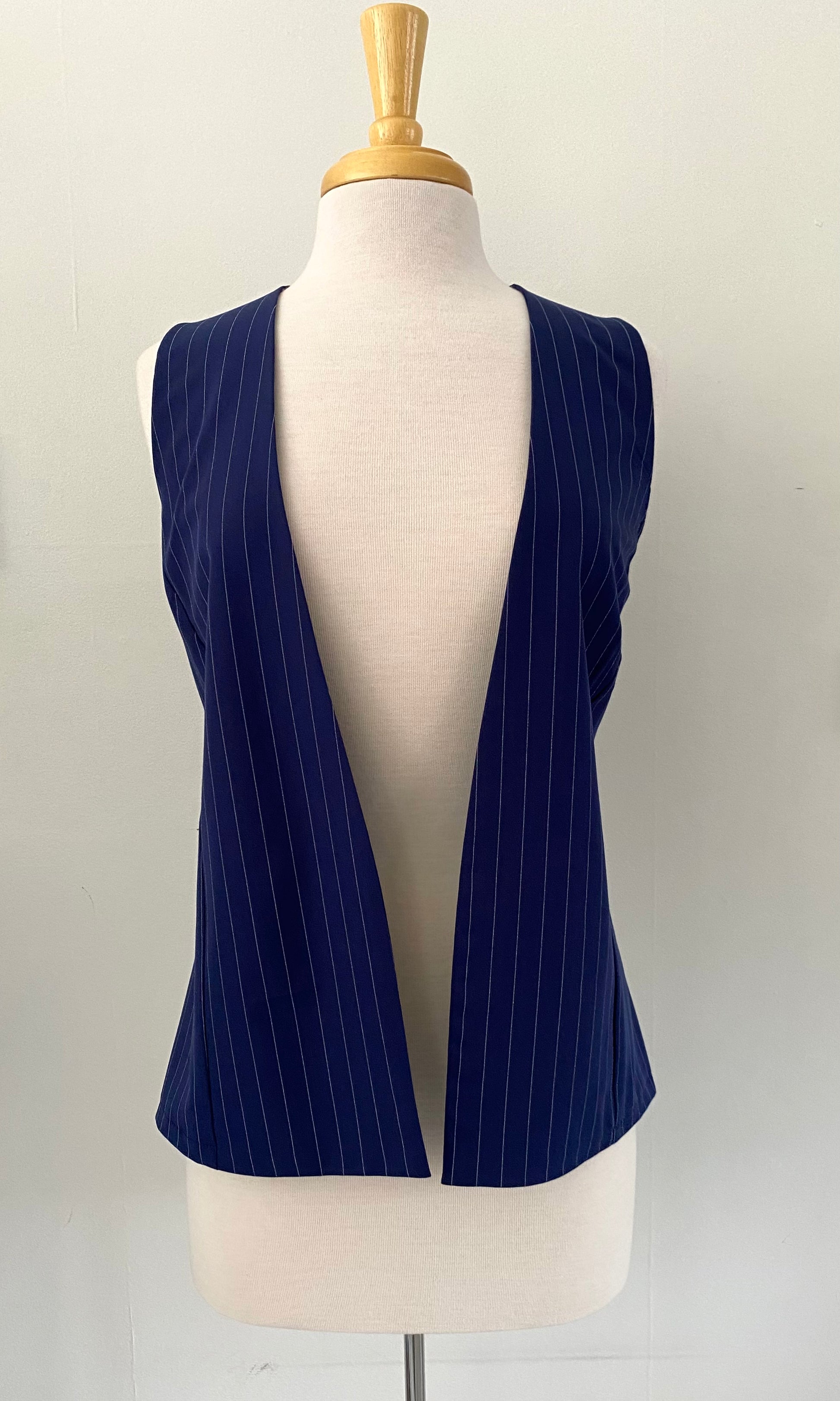 Veste sans manche, longueur aux hanches, coupe classique, disponible en noir ou bleu à fines rayures.