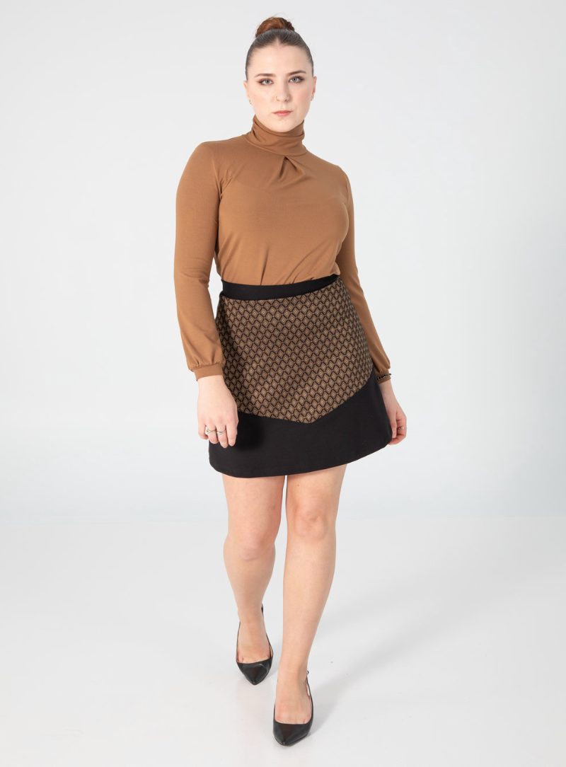La jupe Marcelle est un modèle taille haute, coupe ligne A avec découpe contrastante au bas de la jupe qui s'agence sans effort avec des hauts de différentes couleurs. La matière extensible facilite l'enfilage même sans fermoir. Parfaite pour la vie de tous les jours, elle se transforme aisément et devient votre meilleur allié lors de vos sorties pour un look qui vous fera briller!