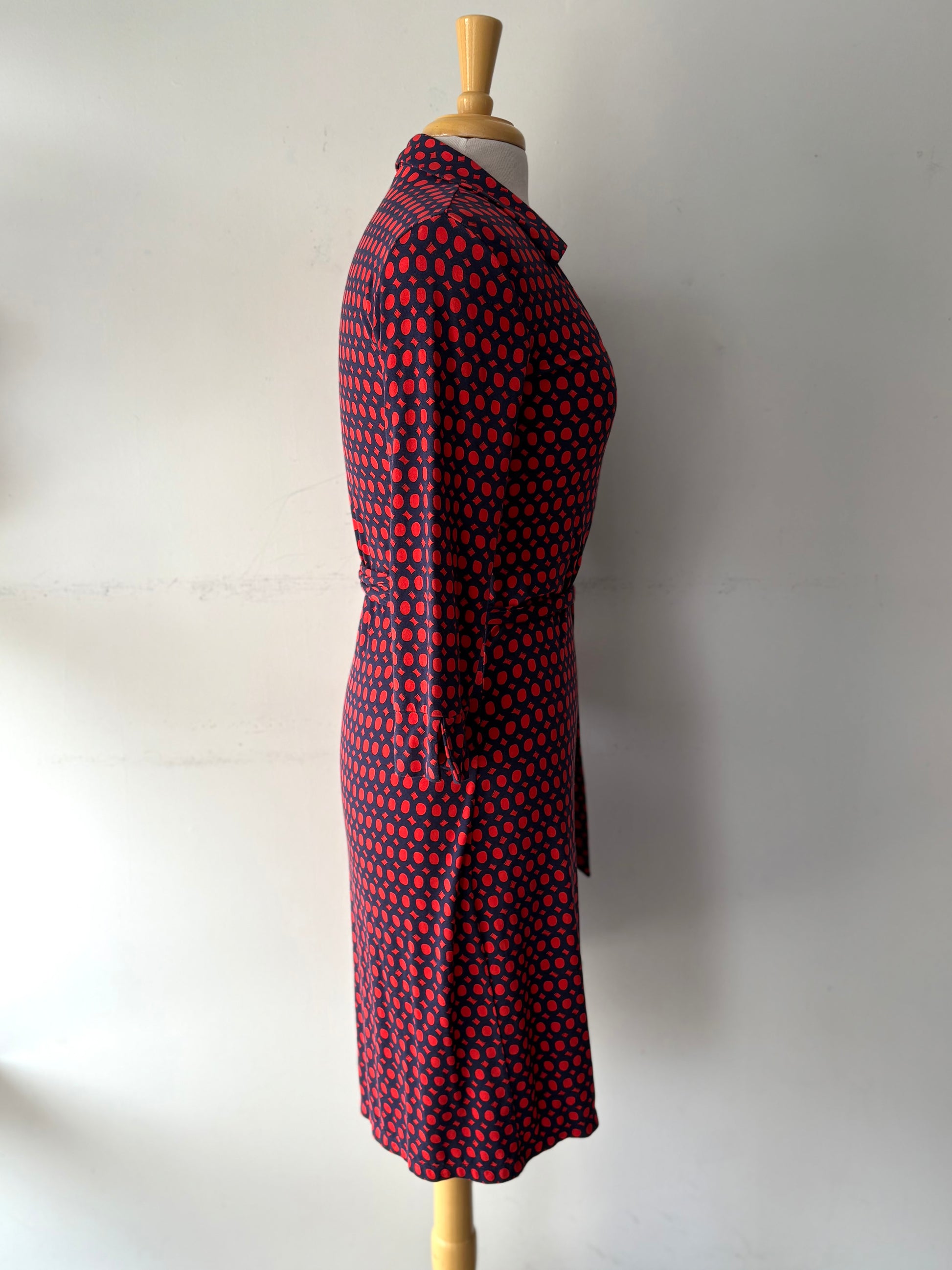 Robe cache-coeur marine/pois rouge, manches 3/4
