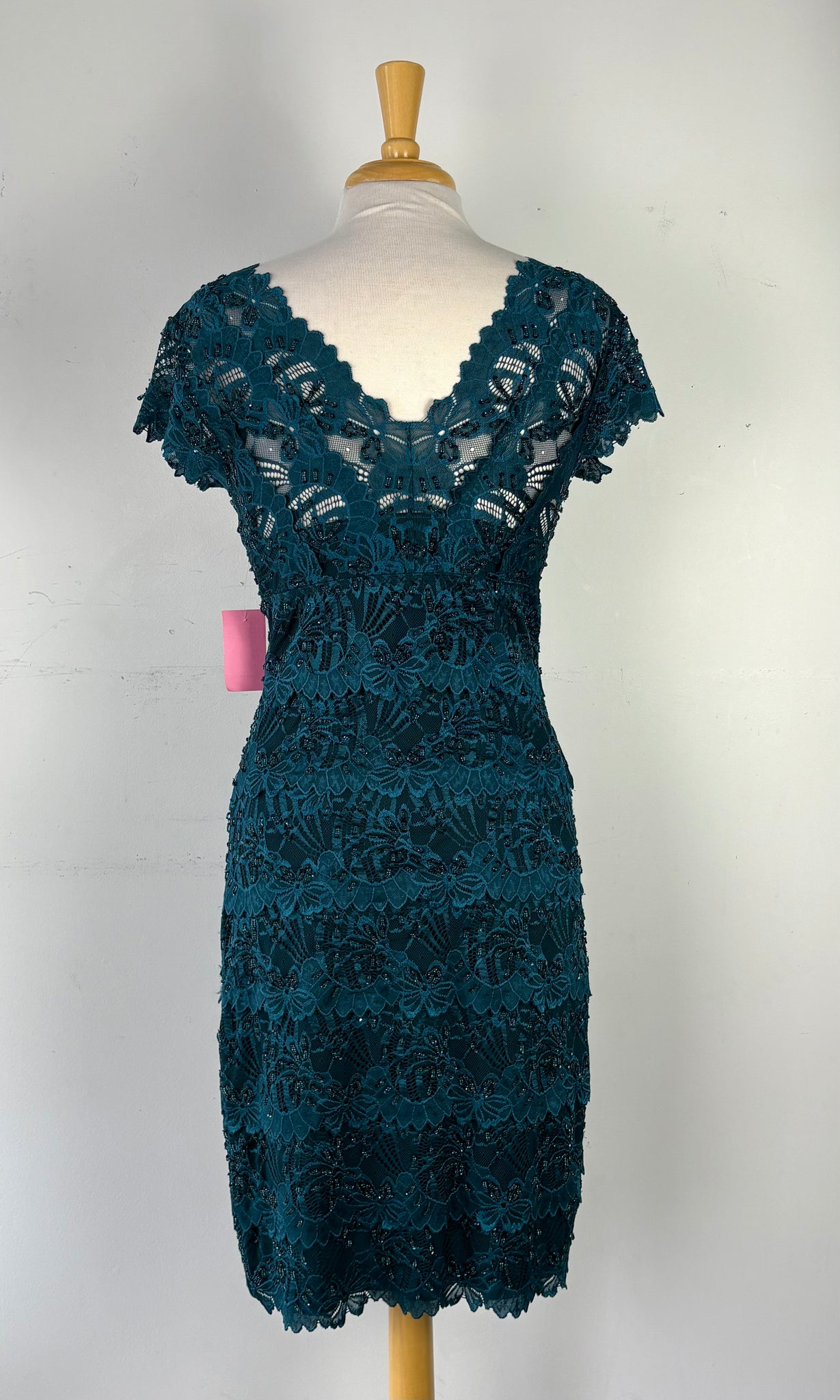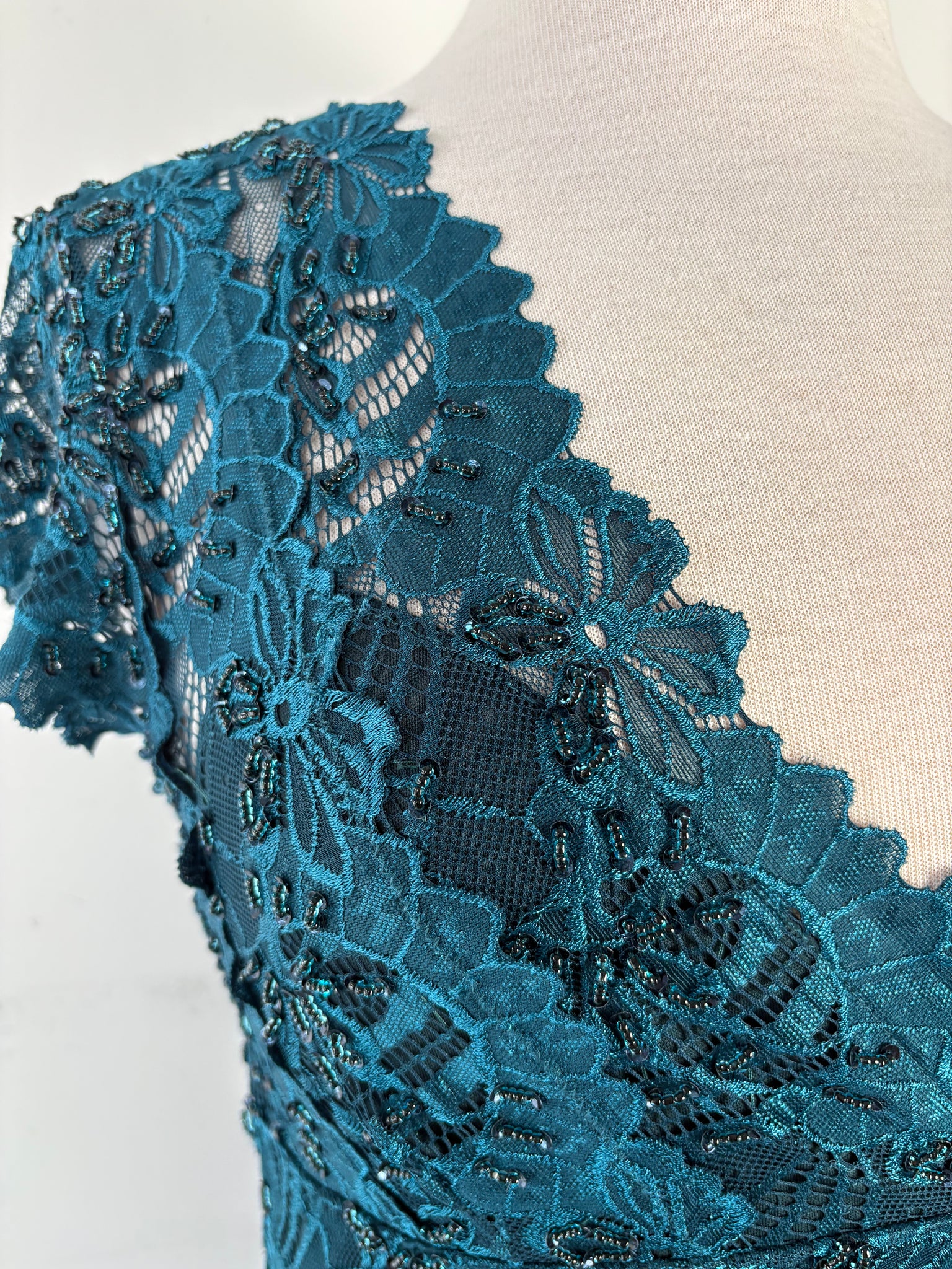 Robe dentelle et paillette fleurs turquoise foncé, pas de manche, encolure en V, robe festive