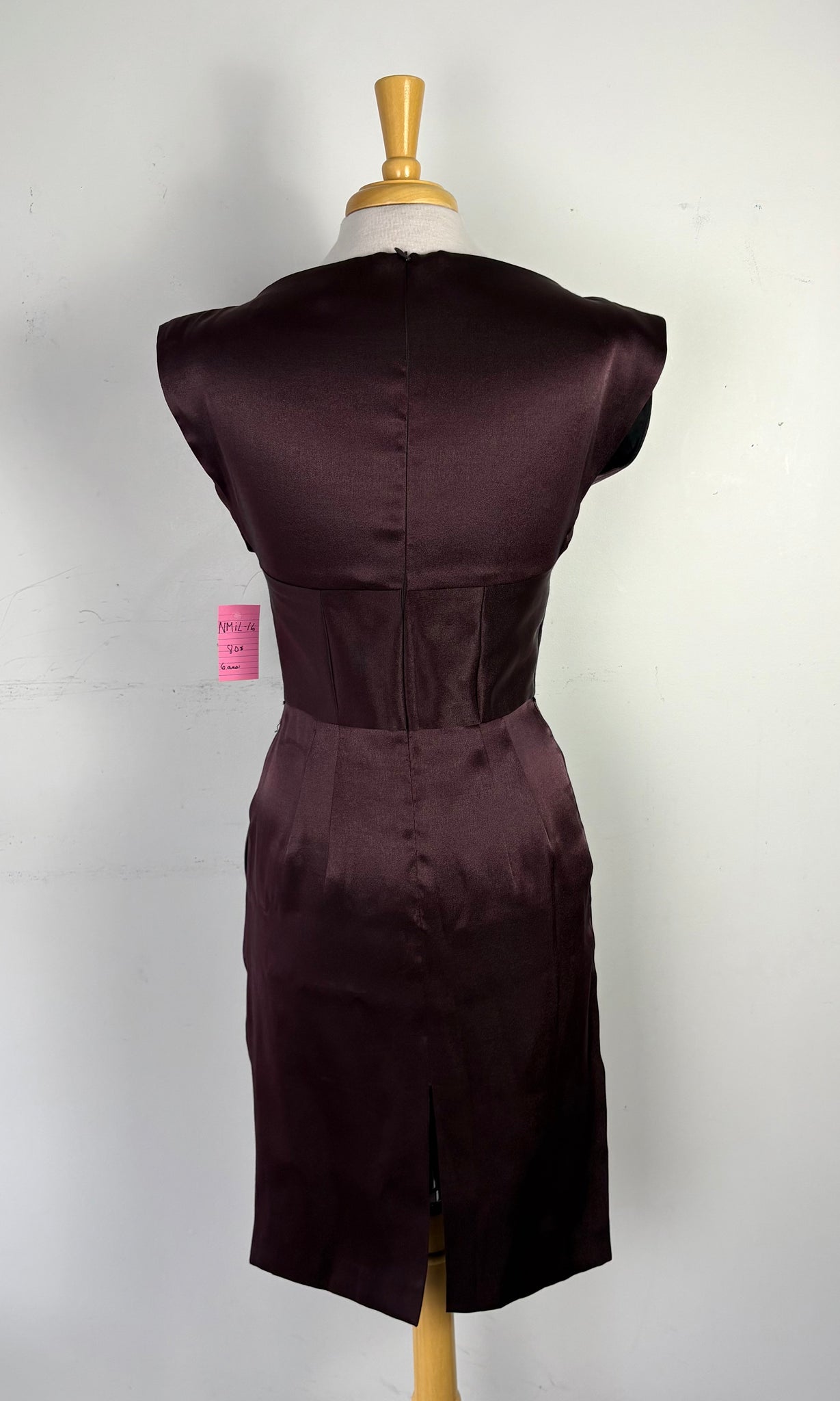 Robe prune satinée, pas manche, poches, ceinturon, style cocktail