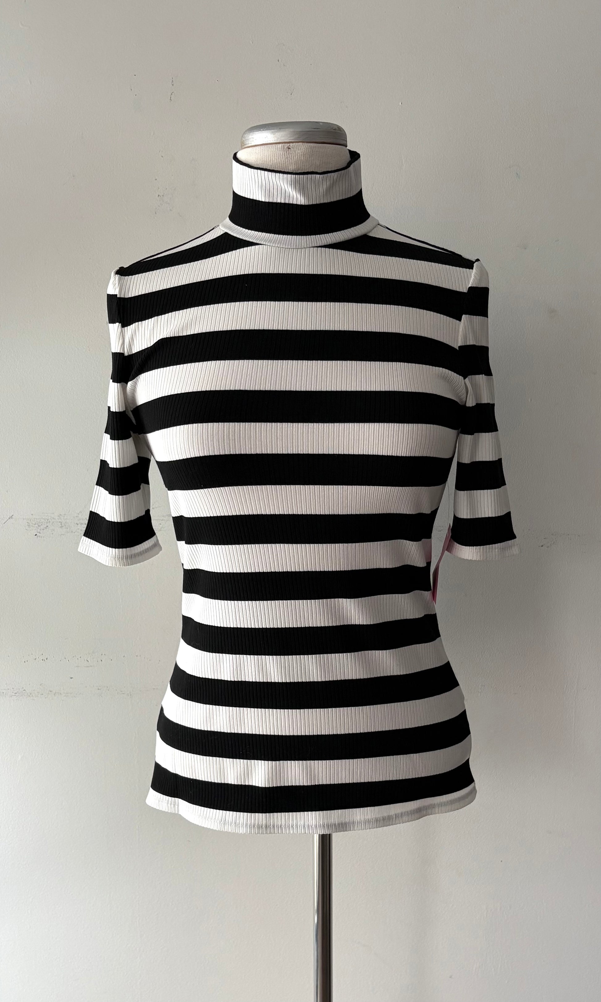 T-shirt noir/blanc rayé, manches courtes, col montant