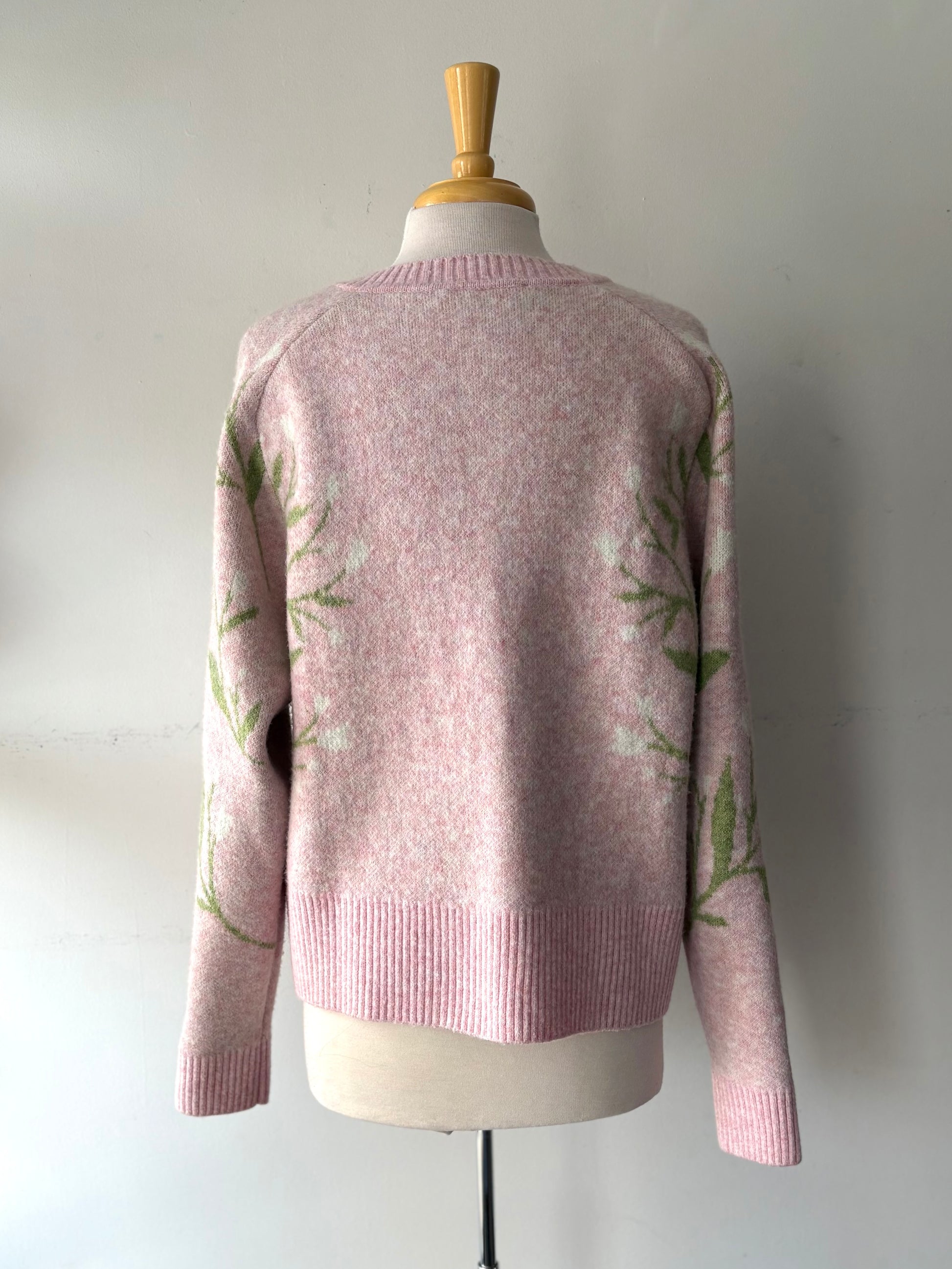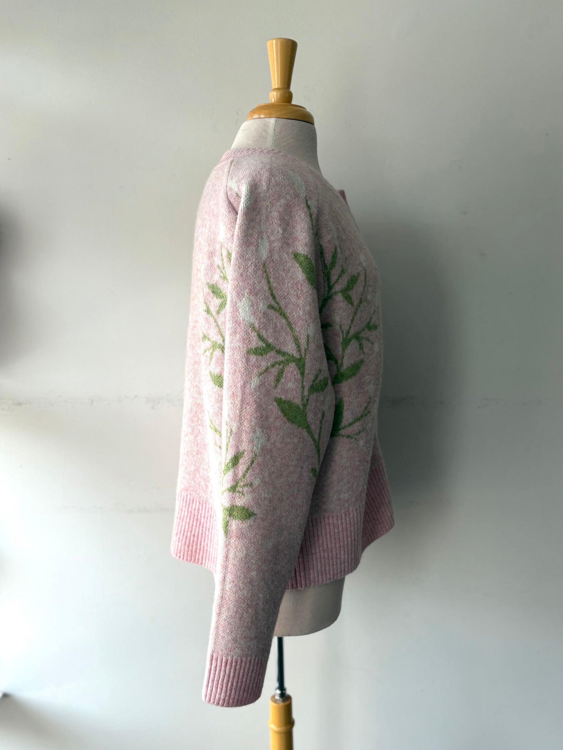 Veste lainage rose pâle, branches vertes fleurs blanches | ASIM-136 (XL)