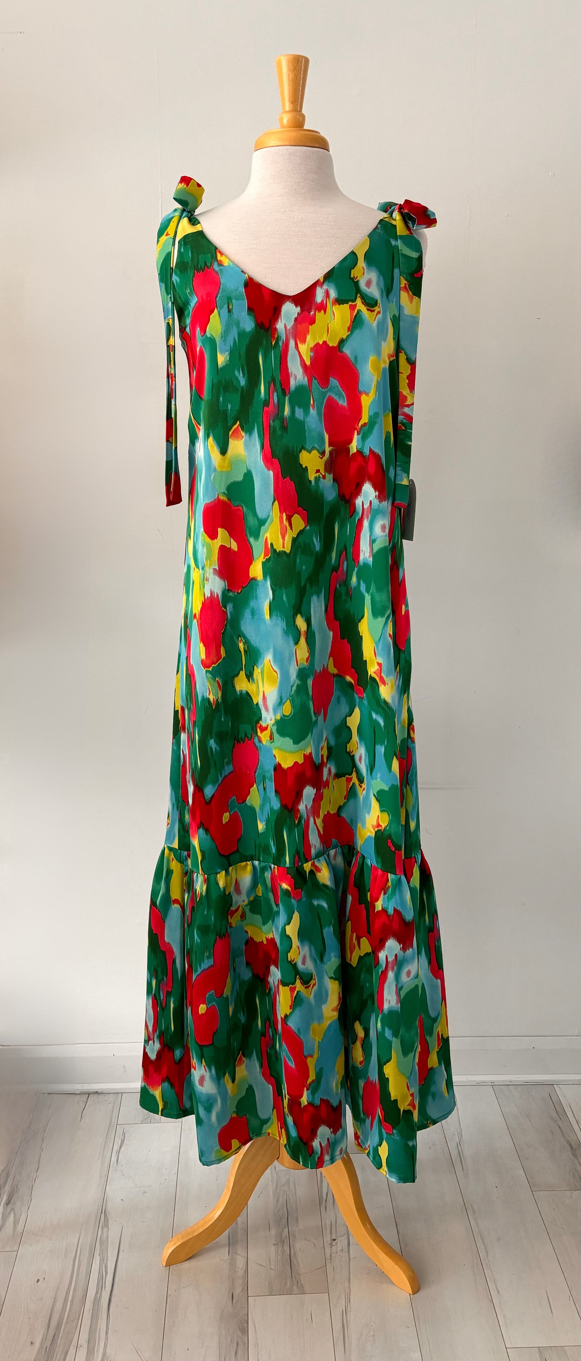 Robe longue avec volant froncé au bas. Attache style ruban aux épaules qui permettent un ajustement pour la poitrine. Jolie encolure en "V" dos et devant. Fermeture invisible au dos. Très souple confortable, tissu fluide parfait pour la saison estivale.