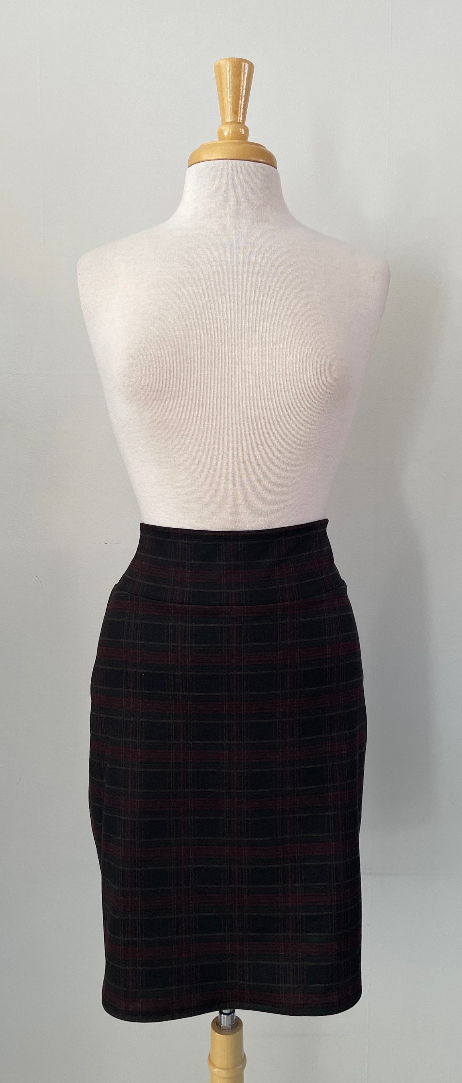 Jupe droite avec pinces au dos, en tissu à motif de carreaux, "stretch" avec une bande de taille élastique.