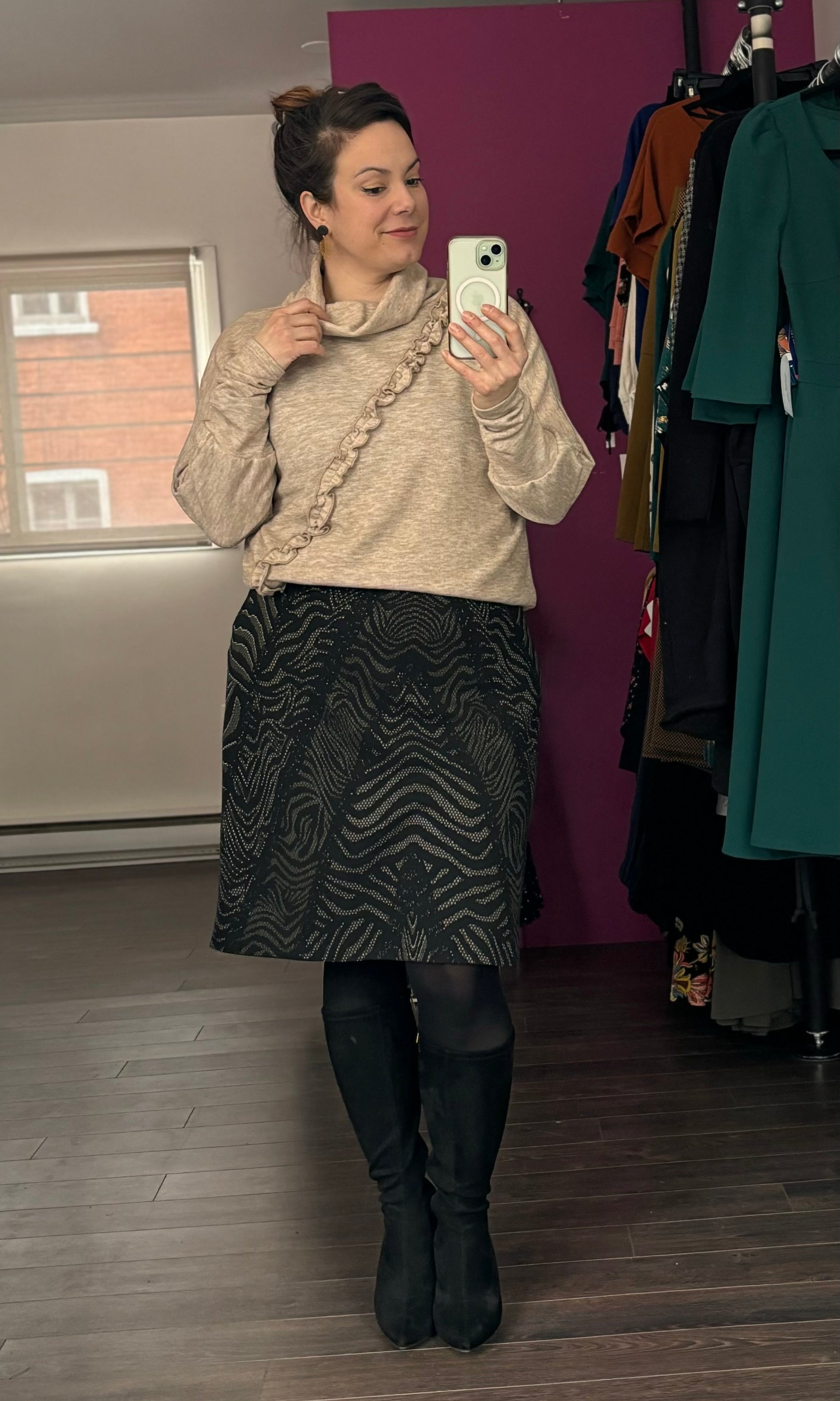 Pour porter en superposition avec un bas plus ample ou sur une robe plus évasée, utilisez notre Élastique Magique pour le transformer en haut plus court.
