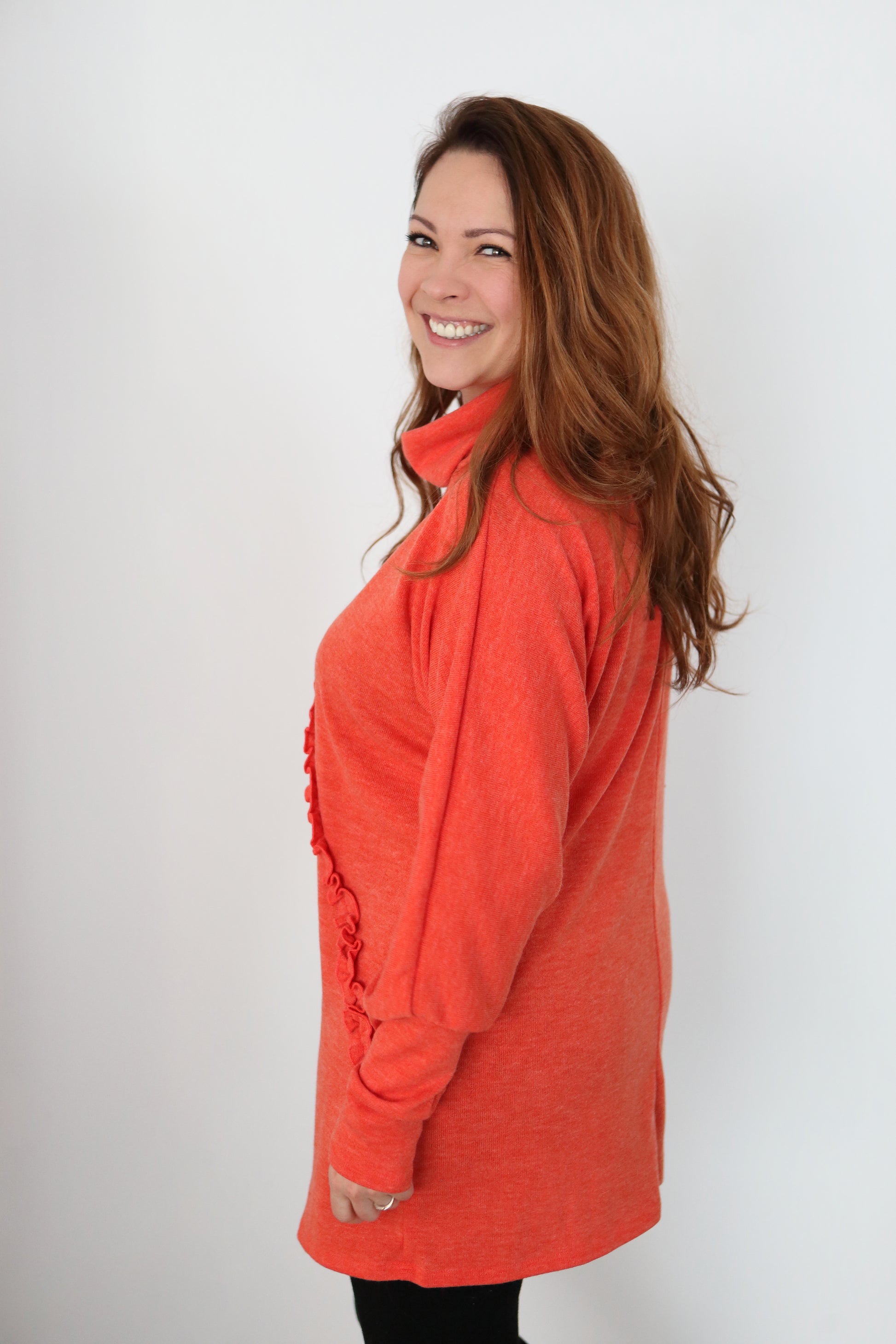 Long chandail chauve-souris hyper doux et confortable. Coupe "oversize" avec manches longues et col roulé. Joli frison au devant pour donner une touche féminine et une ligne asymétrique.