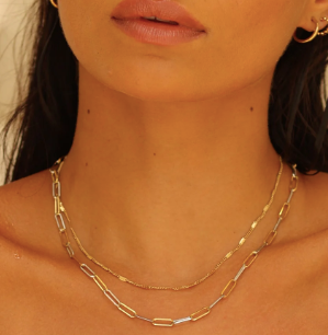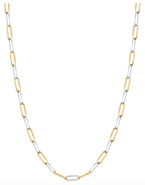 Chaîne trombone bicolore aux maillons audacieux et modernes. Un contraste saisissant qui rehausse n’importe quelle tenue.