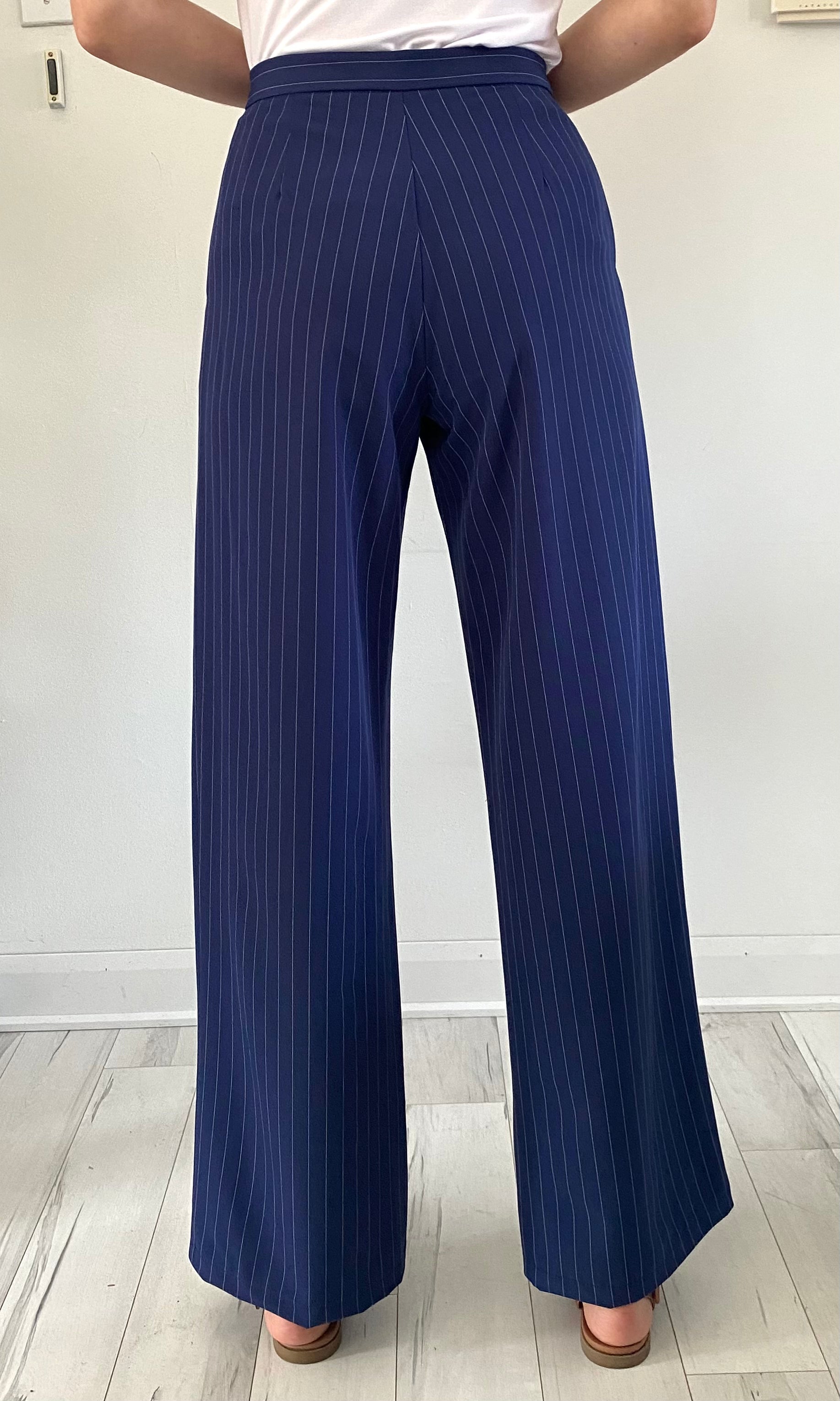 Pantalon jambe large, coupe classique avec poche à l'avant et braguette. Idéal pour le bureau et disponible en noir ou marine à fine rayures.